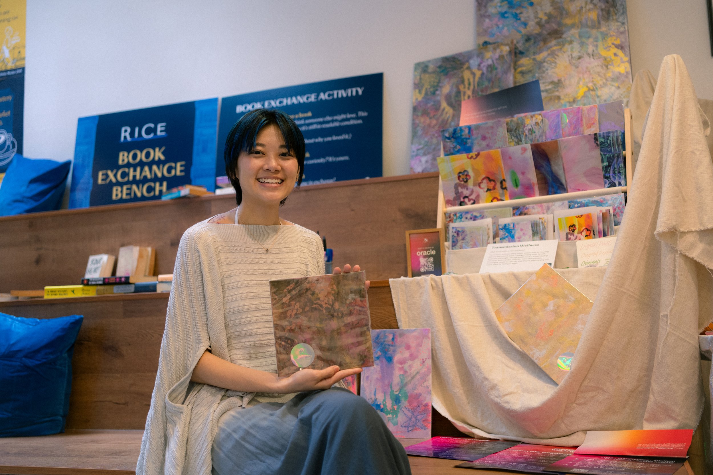 Her work has expanded to include channelled art—original and commissioned pieces that carry frequency and arrive as altar objects for the homes and spaces of those who receive them—and birth support, accompanying mothers through one of the most liminal thresholds of human experience. Both are a natural extension of everything Transmission Wellness has always moved toward: the places where form and the formless meet.